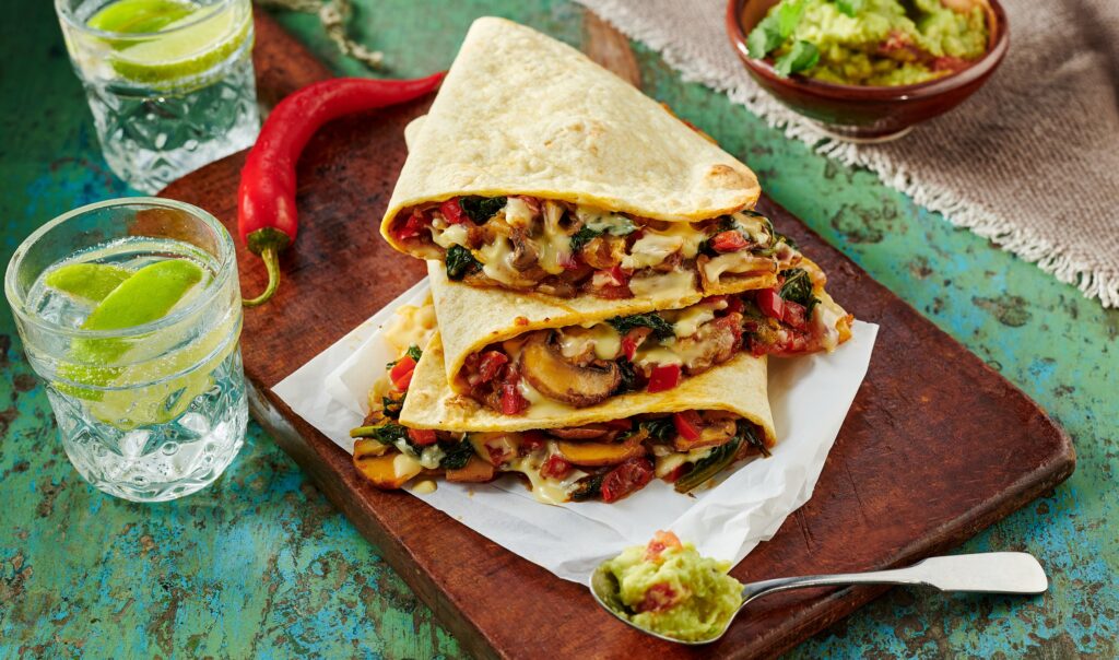 Най-добрите тексаско-мексикански препечени сандвичи с тортия! Тези вегетариански кесадии се пълнят със сотирани гъби, чушки, сирене, Kikkoman PONZU цитрус и лук и се пекат, докато станат хрупкави отвън и се разтопят в средата. Сервирайте топли от фурната, нарязани на триъгълничета.