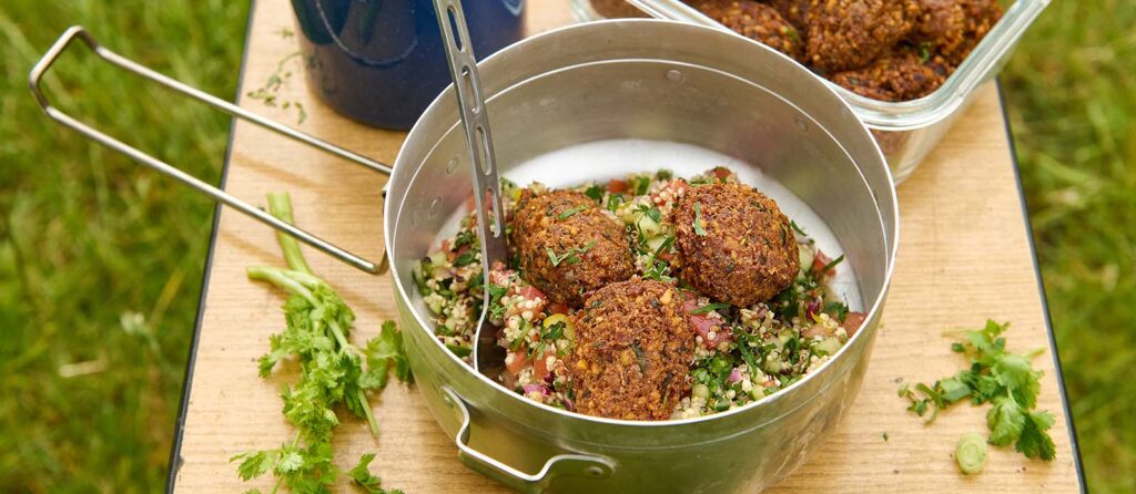 Здравословно и ароматно ястие, което съчетава лекотата и свежестта на традиционната салата табуле с хрупкав фалафел. Киноата с ядки пък добавя вкус и хранителност, а пресните билки и зеленчуци я правят наистина неповторима. Насладете се на храната на открито и открийте природата на умами с перфектното трио Kikkoman PONZU цитрус, Kikkoman естествено ферментирал соев сос и Kikkoman препечено сусамово олио.