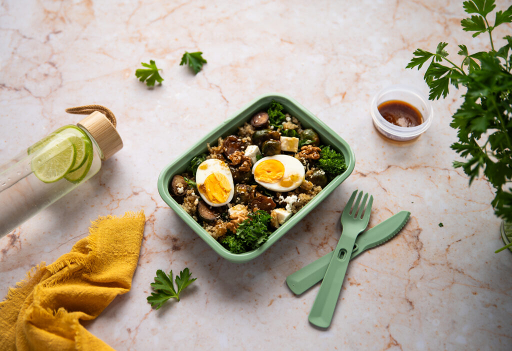 - Сварете яйцата за 7 минути, докато се сварят твърдо. Отстранете твърдите стъбла от къдравото зеле и го нарежете на по-малки парчета. Прехвърлете киноата в кутии за обяд, след което добавете брюкселското зеле, къдравото зеле, разполовените яйца и сирене фета.