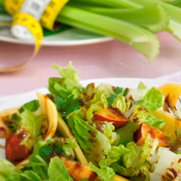 Измиваме нектарините, разрязваме ги наполовина и премахваме костилките. Обелваме мангото, изваждаме месестата част и го нарязваме на кубчета. Отделяме листата на марулята, измиваме ги и ги нарязваме на ивици. След това измиваме и нарязваме и целината.