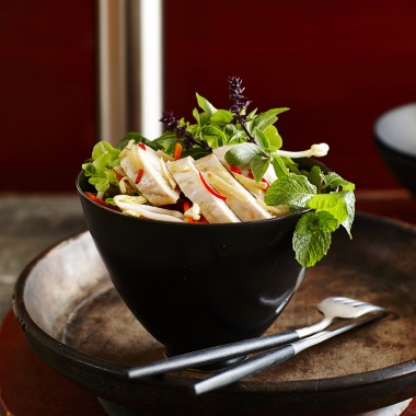 В купа приготвяме салатата и я разпределяме на 4 порции. Върху всяка порция слагаме филета и поливаме с дресинга. Сервираме украсени с мента и коридандър.