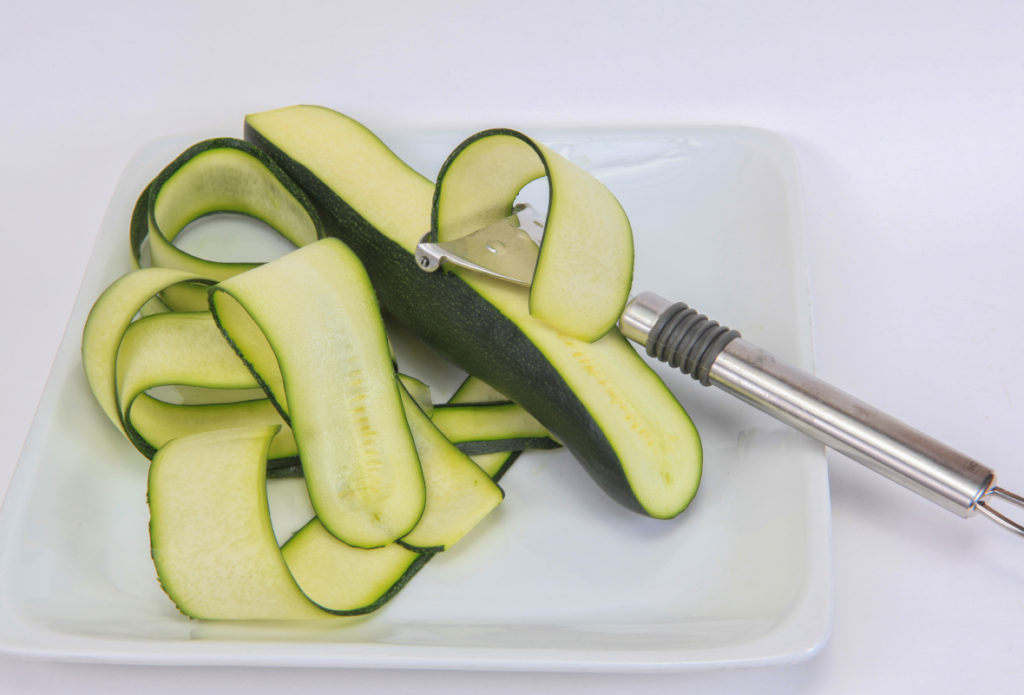 С помощта на белачка или подходящо ренде нарежете тиквичките на тънки равномерни ленти. Нарежете копъра, счукайте чесъна и ги добавете заедно с тиквените семки към тиквичките. Сипете малко от подправките – преди сервиране ще доподправите салатата.