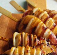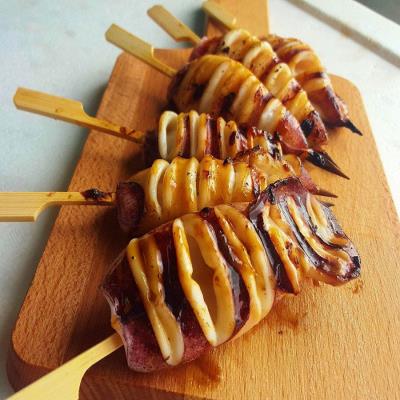 Лентите от калмари се нанизват зигзагообразно на дървени шишове, предварително киснати в студена вода за 20 минути. Слагат се в предварително нагорещения грил и се изпичат за 1-2 минути.