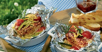 Взимаме 4 листа алуминиево фолио, достатъчно голямо, за да завием пакетчета. Нареждаме във всяко пакетче парче сирене, домати, тиквичка, лук и стъркче розмарин. Завиваме добре пакетчетата и ги печем на барбекю около 15-20 минути.