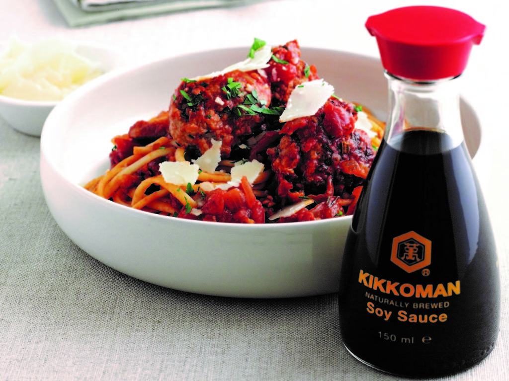 - Добавете доматите, водата и лютия червен пипер, след което и кюфтетата. Гответе в продължение на още 15-20 минути или докато кюфтетата се приготвят напълно. Подправете със соевия сос Kikkoman, черния пипер и захарта.