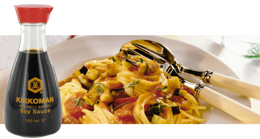 В подходящ съд слагаме водата за спагетите да заври, като към нея добавяме 1-2 супени лъжици соев сос и малко масло. Накъсваме билките и ги нарязваме на ситно, като добавяме към тях червения пипер и чесъна /нарязан на много дребно/. Задушаваме билките и чесъна в тиган, като преди това добавяме 50 мл соев сос.