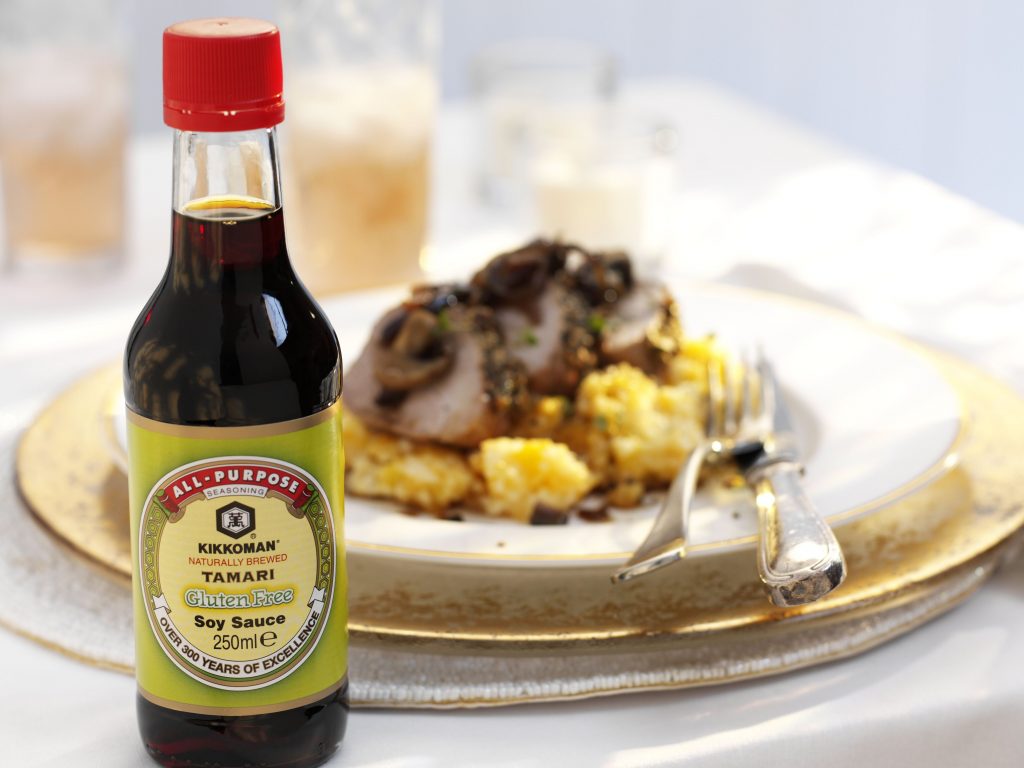 • Докато месото се готви, пригответе гарнитурите. Загрейте зехтина в тиган, добавете лука и гответе на ниска температура, докато лукът омекне. Добавете гъбите и мащерката и гответе за още 5 минути. Изсипете безглутеновия соев сос Тамари, добавете 3 с.л. вода и кафявата захар и гответе за още 10 минути, докато сосът стане гъст и лепкав.