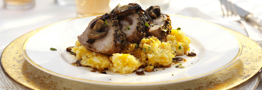 Сервираме свинското месо нарязано на дебели резени с гъбите и лука, като гарнираме с зеленчуковата каша.