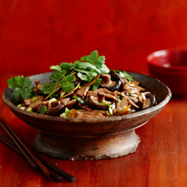 Слагаме свинското в неметална чиния. Заливаме го с Терияки марината и го слагаме в хладилника за 20-30 минути или за по-дълго време, ако искаме да има по-силен аромат. Изваждаме свинското от маниранатата. Загряваме 2 лъжици олио в уок тиган и изпържваме свинското, нарязано на ленти, от двете страни за по 2 минути или докато покафенеят. Изваждаме ги от уок тигана. Добавяме останалото олио и запържваме запържваме лука, чесъна и джинджифила. Връщаме месотов тигана, също и гъбите, бок чоя, сладкия чили сос и 3 супени лъжици вода. Готвим още 1 минута, докато бок чоя омекне, но остане хрупкав. Сервирайте в 4 чинии малко ориз, а върху него поставете пърженото свинско с гъби. Декорирайте с листа кориандър и лютата чушка.