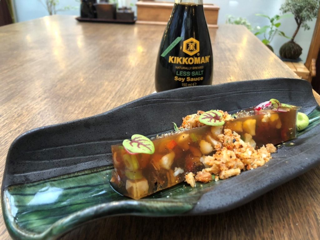 - Сваряват се месото със зеленчуците за бульона, след което месото се изважда, обезкостява се а бульонът се прецежда. Добавя се соевият сос Kikkoman.