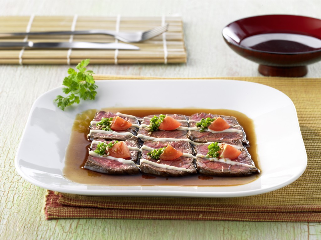 подредете в чиния рукола и кръгчета лук, като добавите и тънки парчета от месцето. Полейте леко с Терияки соса и уасаби майонезата. Аз лично го украсявам по мой вкус с резенчета домати и зеленина, но вие може да използвате нарязани на кръгчета маслини, малко чушки и див чесън за цвят 🙂 Е, ще опитате ли това ястие скоро?