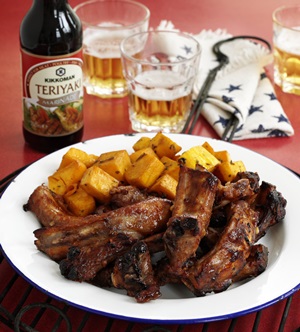 5. Междувременно намажете ребърцата с останалата част от маринатата и преместете на грила или барбекюто за още 10 минути, като ги обръщате от време на време. Сервирайте с тиквата и салата.