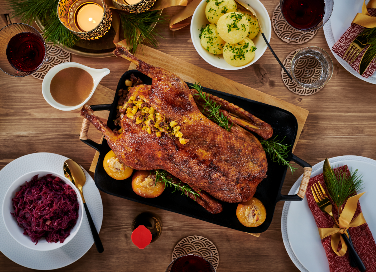ГЕРМАНИЯ. Традиционна коледна вечеря от печена патица или гъска се сервира вечерта на 24 декември в Германия. Хората в някои региони също ядат шаран, пъстърва или обикновена картофена салата с колбаси. Раклет е друго популярно коледно ястие в Германия.