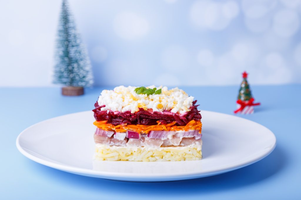 РУСИЯ. Едно традиционно коледно и новогодишно ястие в Русия е руската салата, известна в Европа и като салата “Оиливие”. Съдържа картофи, корнишони, грах, яйца, моркови и варено телешко, пилешко или мляно месо – всичко това е смесено с щедра порция майонеза. Друго популярно празнично предложение е херинга „в шуба” – слоена салата от маринована херинга, покрита с варени картофи, моркови или цвекло. Цвеклото придава на салатата типичния лилав цвят.