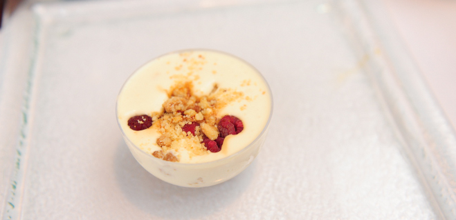 В подходящи съдчета (чашки) сложете от маслените трохи на дъното, разпределете крема по равно навсякъде и сложете плодове по ваш избор (ние използвахме малини и къпини). Поръсете отгоре с още малко от трохите и декорирайте с останалия соев карамел.