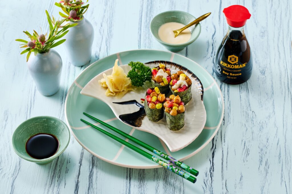 Това веган суши се сервира в специални „гункан“ — суши лодки, гарнирани с печен нахут, сладка царевица и нар за неустоимо сливане на текстури и умами вкусове. Свежо, ароматно лакомство, което няма да искате да пропуснете! А ароматът му е гарантиран от уникално Kikkoman трио: Kikkoman оризов оцет за суши, Kikkoman Терияки марината и ½ ч. л. Kikkoman PONZU цитрус.