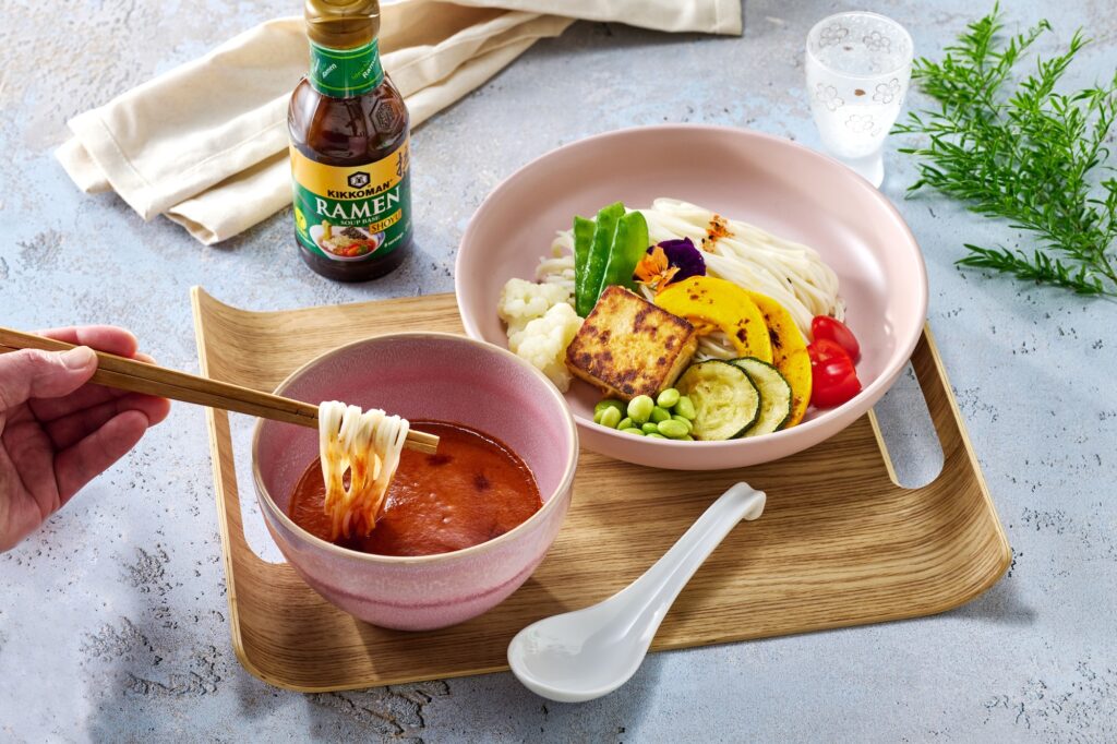 Този веган цукемен е с рамен юфка в богат доматен сос, пълен с пресни зеленчуци. Насладете се на тръпчивия, ароматен и освежаващ вкус и регулирайте пикантността по свой вкус. За отличния умами вкус може да се доверите на дуото Kikkoman основа за рамен супа и класиката естествено ферментирал соев сос Kikkoman.