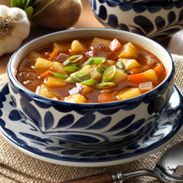 Готвим супата на средна температура, докато лукът леко покафенее – около 15 минути. Добавяме бульона или водата, магданоза, босилека, доматената паста и Кикоман соев сос лайт.