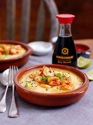 Оригиналната рецепта се казва “Полента със скариди”. Но знам, че полентата прилича на качамака, а качамакът на мамалига или обратното. Май и 3-те са почти едно и също. Затова избрах българската дума “качамак”. Прилагателното “японски” слагам, защото в продуктите участва незаменимия и верен на всички майстори-кулинари японец – Кикоман натуралния соев сос. Стига приказки, да се захващаме за готвене:
