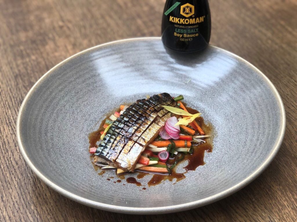 - Филето скумрия се почиства от костите, премахва се тънката ципа от кожата и се набраздява с помощта на нож. Намазва се добре със соев сос Kikkoman и балкански мед.