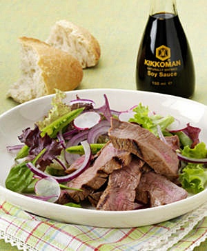 Японските рецепти са лесни и трудни едновременно. Имам предвид, че готвенето е като всяко друго занимание – иска постоянство и тренировки. Представете си как един състезател по маратонско бягане тренира поне два или три пъти седмично, а някои тренират всеки ден! Така е и кухненските рецепти – ако ги упражняваме редовно, ще ставаме все по-добри в различните техники. Ще се научим все по-добре да работим с различните храни и да познаваме отлично свойствата и вкусовите качества на подправките. Е, може би се поувлякох, като ви изнесох тази малка лекция :), но точно такива мисли ми се въртяха в главата. Сега преминавам към днешната японска рецепта, която искам да споделя с вас, моите читатели: Зелена салата с телешко месо и Кикоман соев сос лайт.