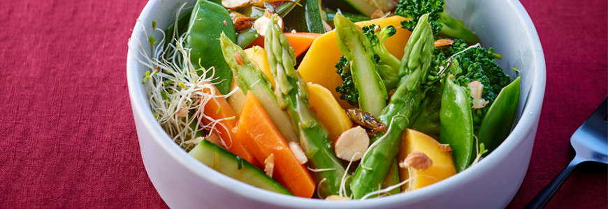 Обелваме и измиваме зеленчуците, нарязваме ги на едри парчета. В уок тиган загряваме зехтина и соевия сос и ги изпържваме за 8 минути – първо морковите, цвеклото и рятата, а на тиквичките, зеления грах и аспержите им трябват около 6 минути. Разбъркваме ги периодично. Имайте предвид, че зеленчуците трябва да останат хрупкави.