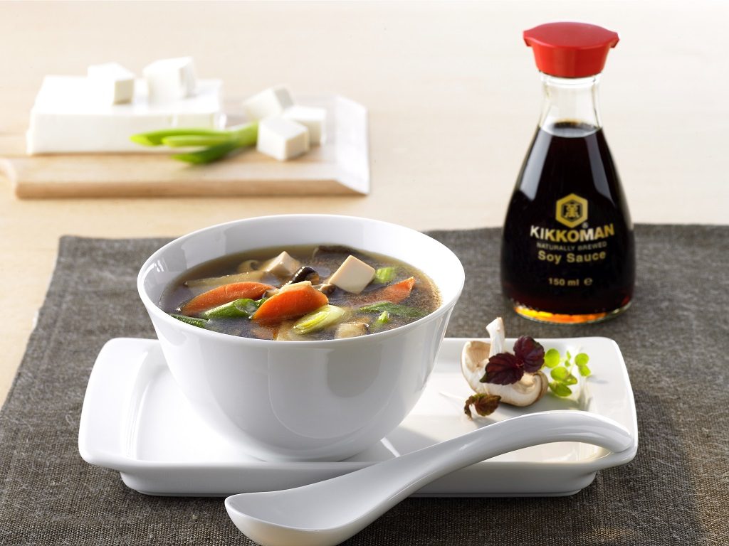 - Подправете със соевия сос Kikkoman и захарта. Смесете царевичното нишете с водата в друга купа и го добавете след това към супата за сгъстяване. На финала добавете тофуто и зеления лук и оставете отново да заври.