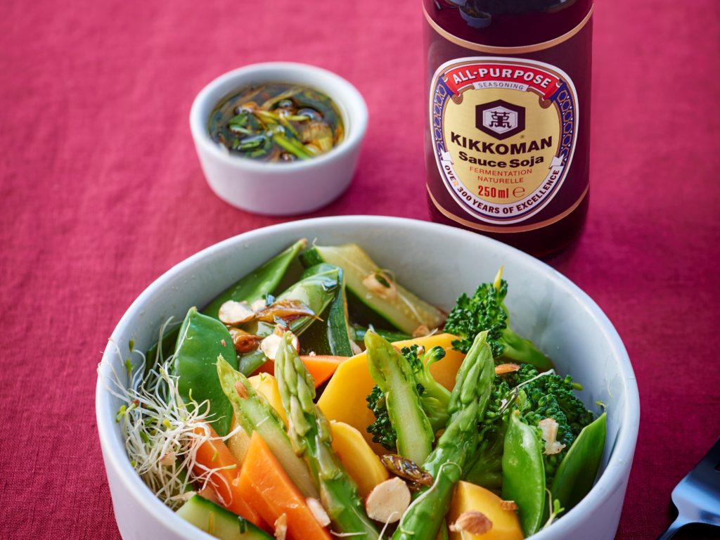 - Обелете, измийте и нарежете зеленчуците. В дълбок тиган сложете маслото и соевия сос Kikkoman и загрейте. Добавете морковите, цвеклото и ряпата и гответе за около осем минути на средна топлина, като разбърквате от време на време.